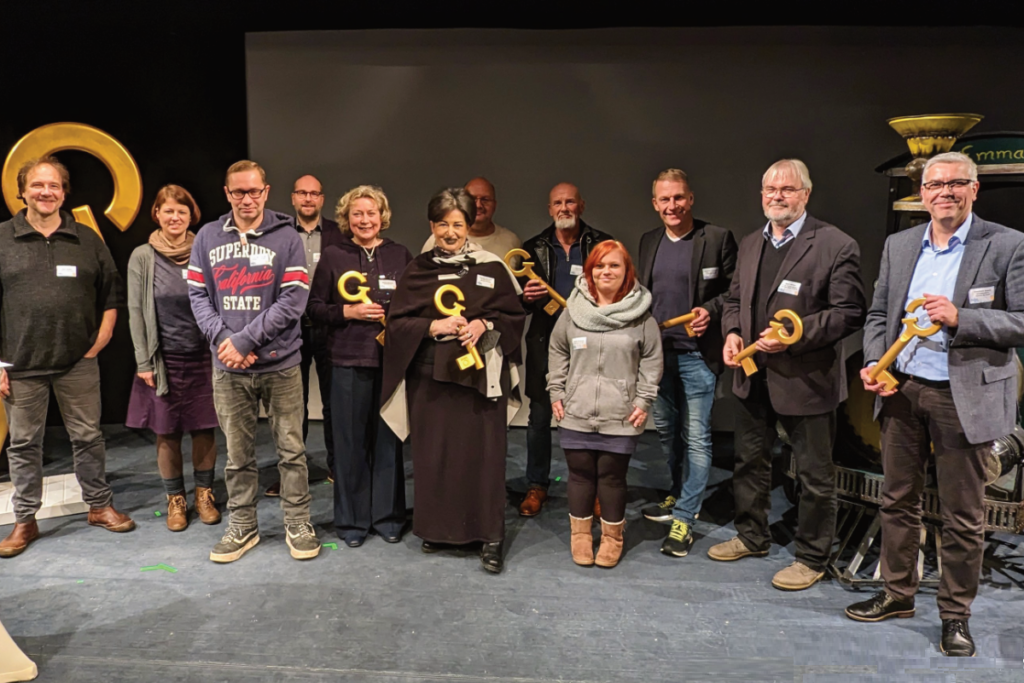 Im Anschluss wurden die Schirmherr*innen vorgestellt und haben aus ihrer Sicht über den Wert von Kultur und kultureller Teilhabe berichtet sowie von den Chancen, die der Kulturschlüssel im Norden als Unterstützung für Menschen mit geringem Einkommen bietet. Der Höhepunkt war die Vergabe der goldenen Kulturschlüssel (siehe Foto).